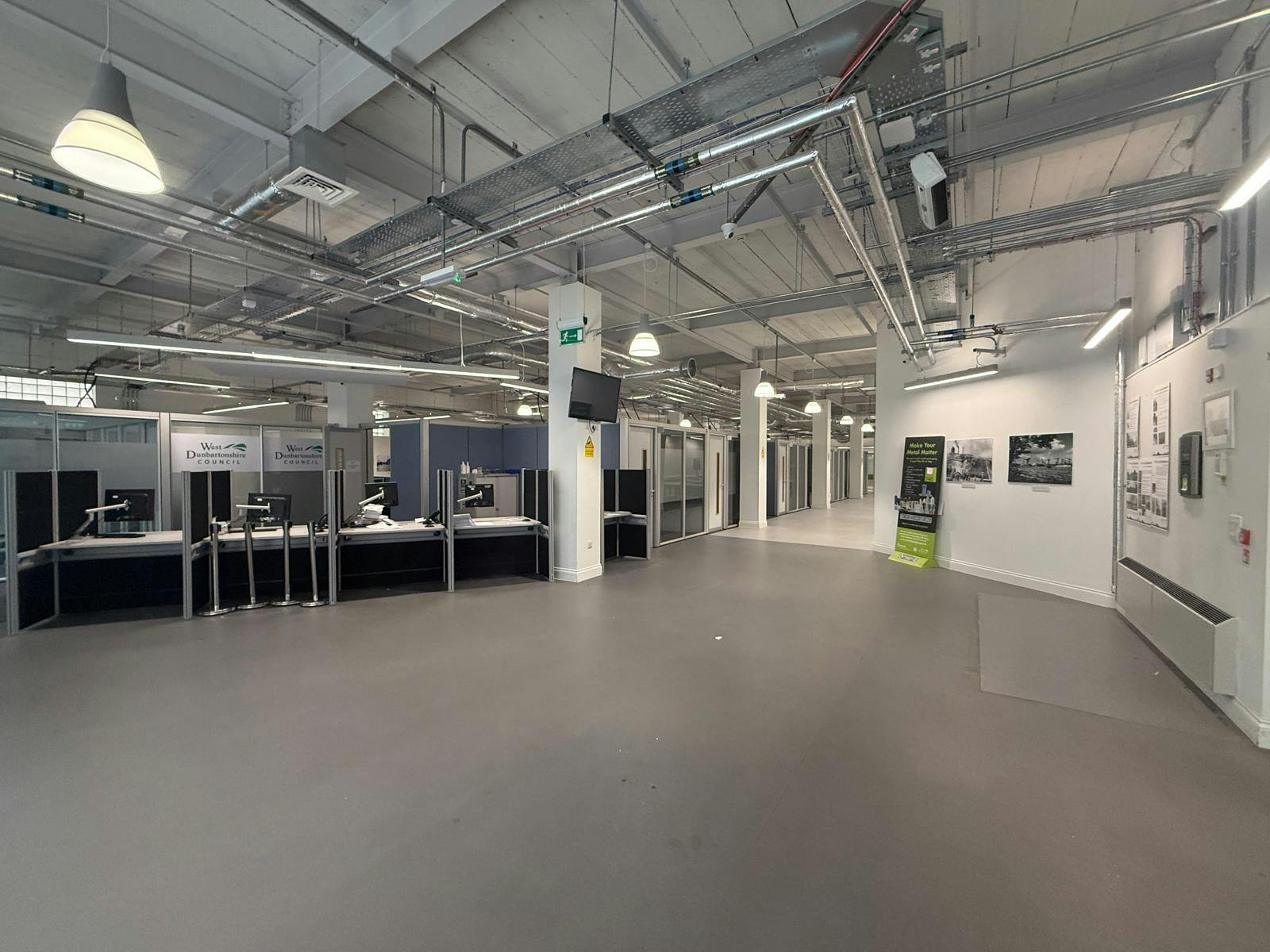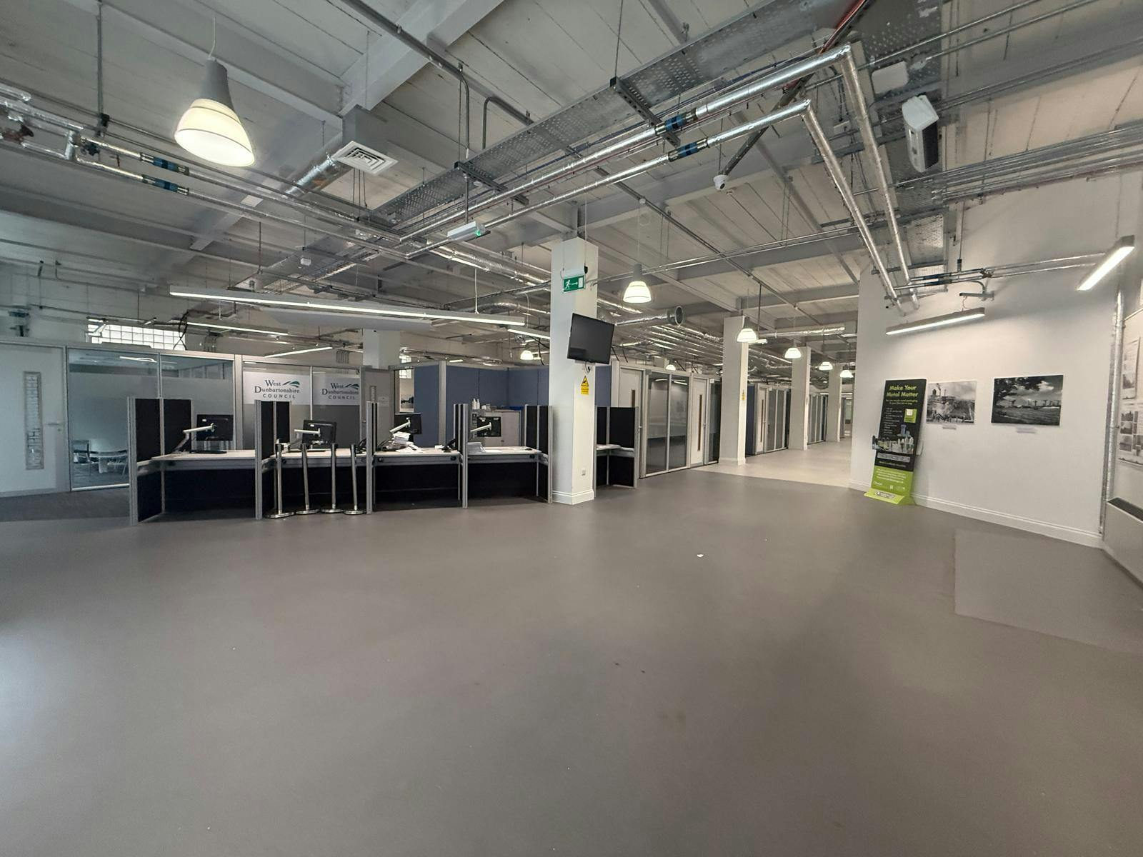 The subjects occupy the ground floor within a 2-storey traditional building, surmounted by a flat roof. The subjects were previously occupied by West Dunbartonshire Council and are arranged to provide a spacious open plan office, with kitchen, toilet and shower facilities to the rear. Access is available from Sylvania Way via a double entrance door, protected by roller shutters within a shared entrance foyer which is interconnected with Clydebank Co-operative Society. Additional access to the premises is on the east elevation onto a shared yard, leading to a communal car park. Allocated parking may be provided on request.