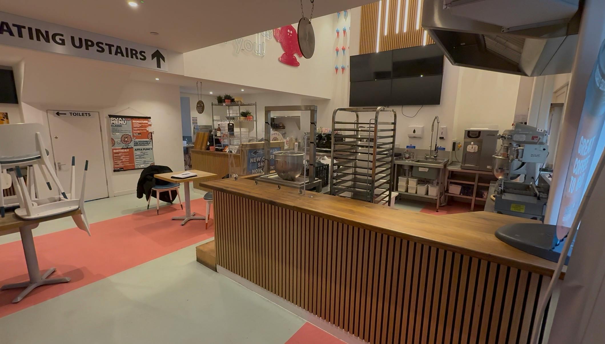The property comprises a mid-terrace unit arranged over the ground and mezzanine floors. The ground floor provides an open plan sales area with kitchen and seating, with additional seating on the mezzanine level. The current layout offers c. 32 covers. The unit is fitted for its former café/doughnut takeaway use, including high quality installations such as extractor systems and fire sprinkler equipment. Subject to negotiation, the former inventory, furniture and fixtures can also be made available offering a turn-key opportunity.