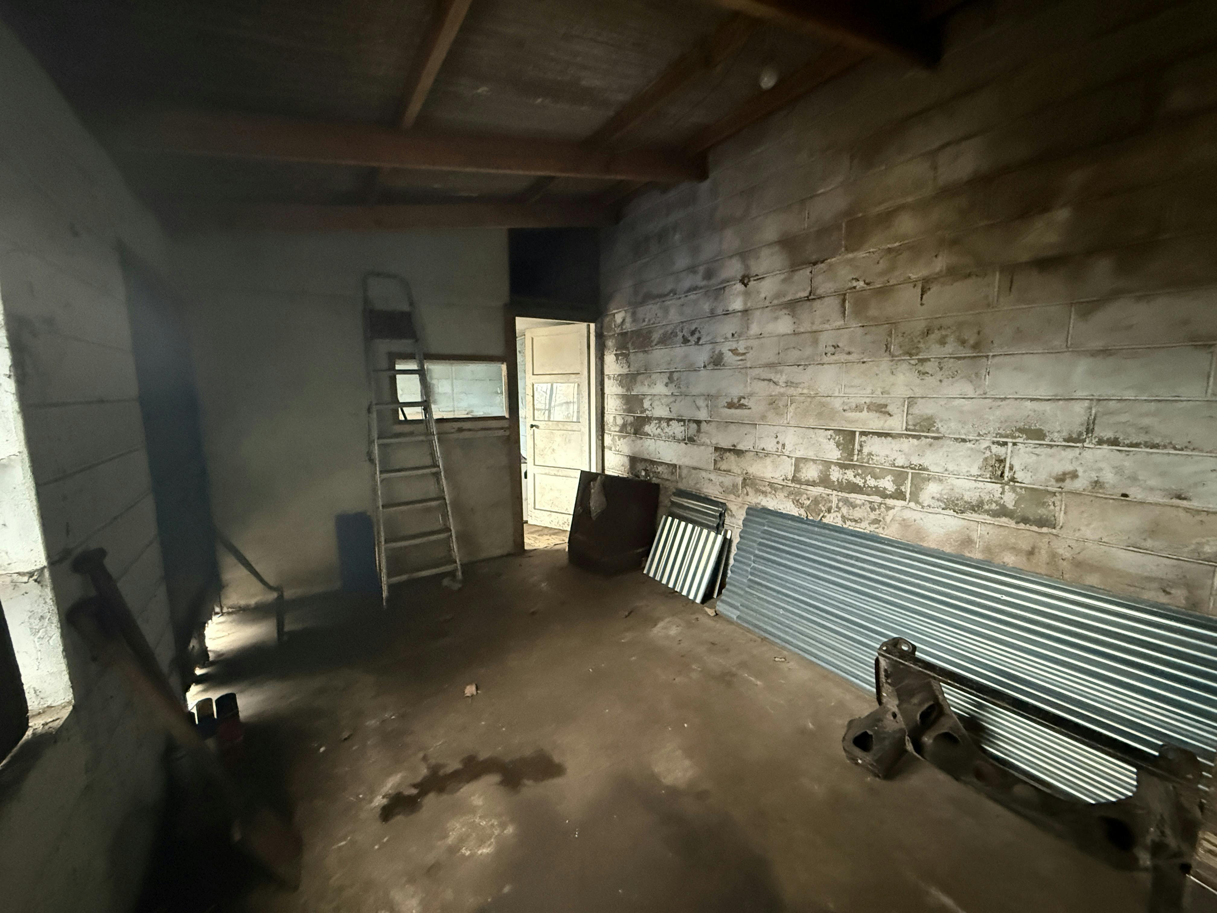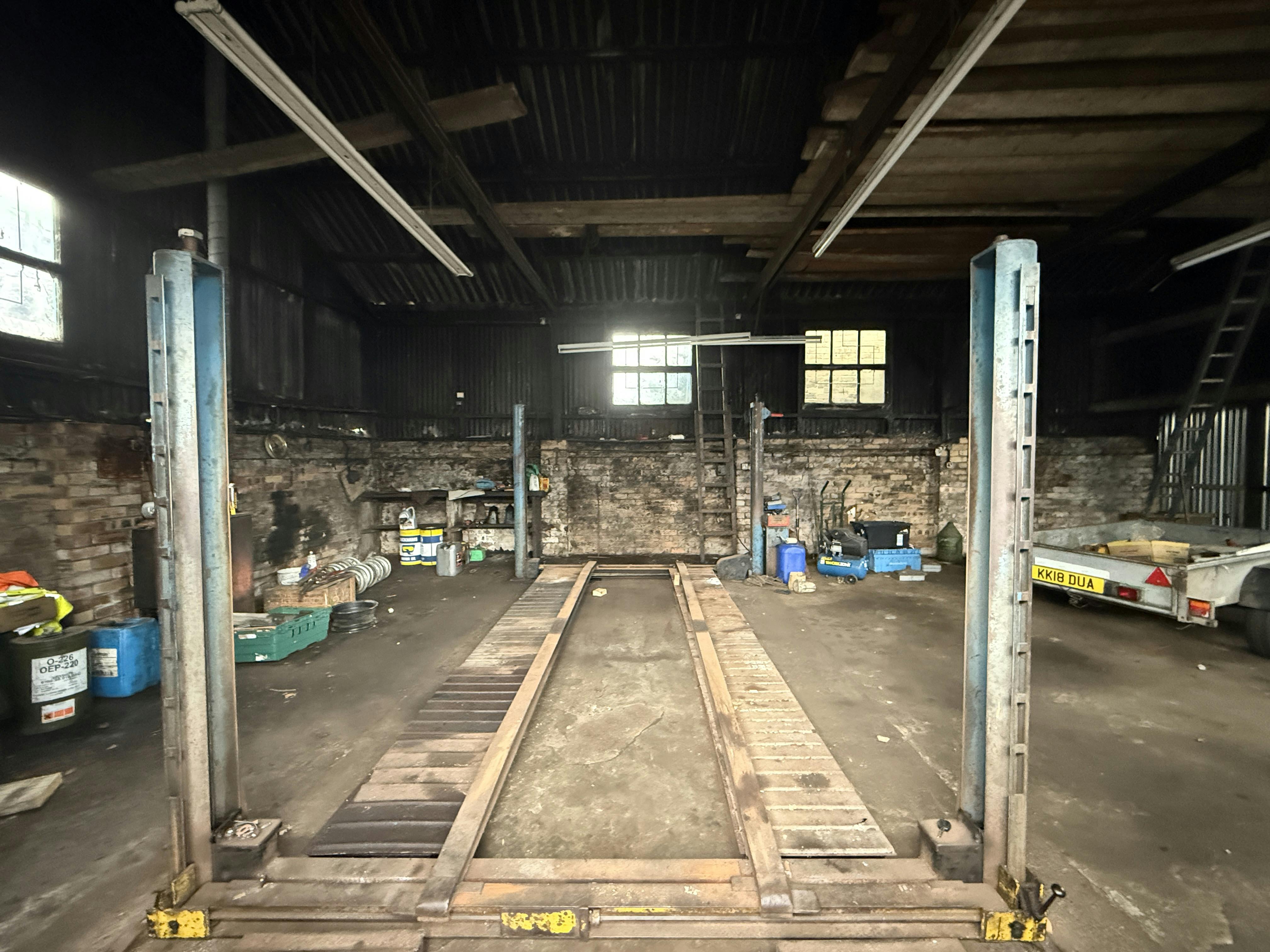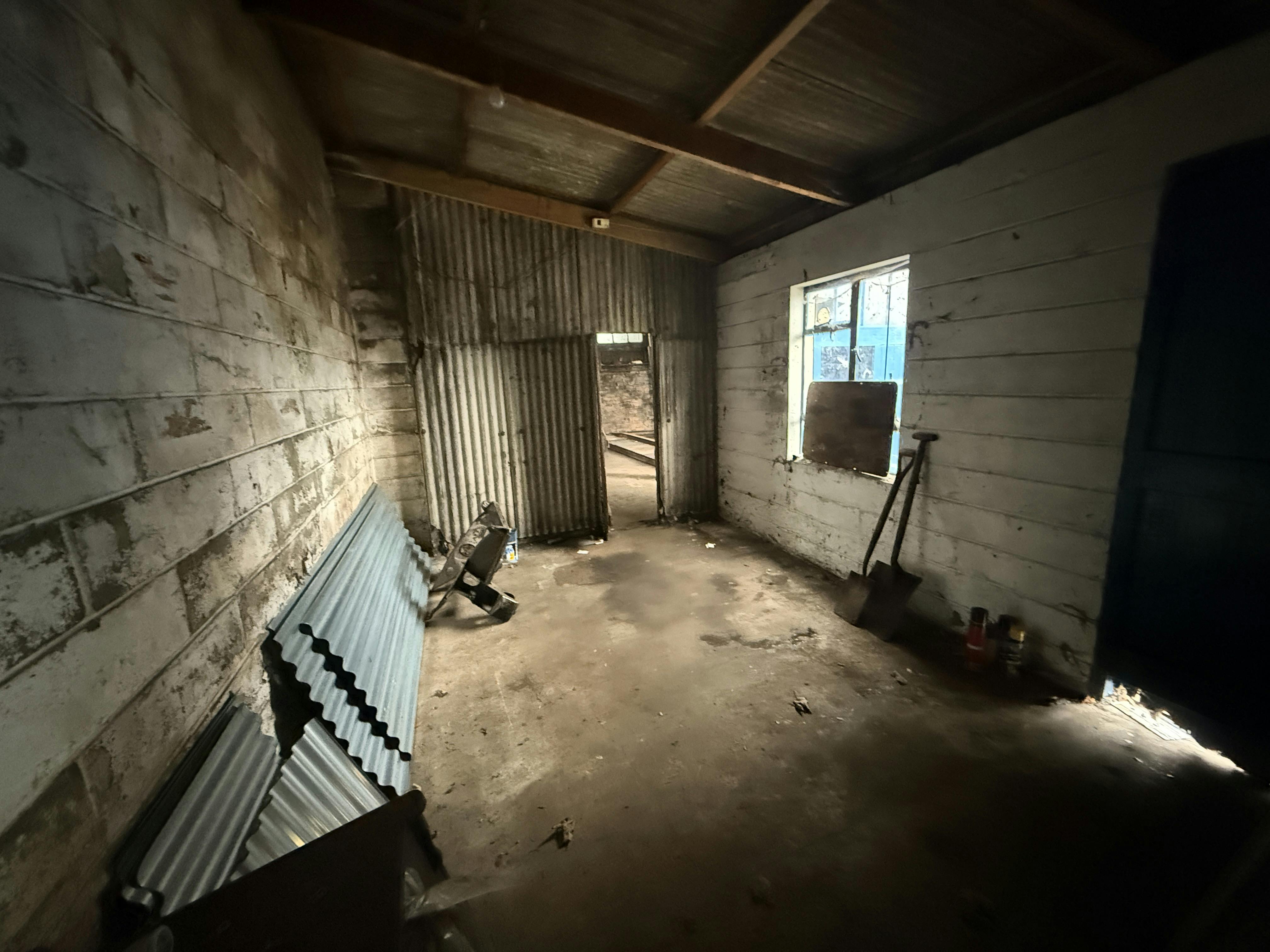 The main building, which is an open-plan workshop/store, is formed by brick walls with corrugated cement fibre sheeting/corrugated metal sheeting to eaves height of approximately 4 metres. There are 2 large, timber sliding doors for loading