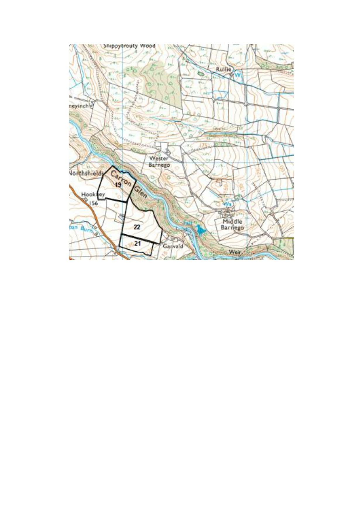 The land by Fankerton is identified as the most northerly fields, outlined in black on the sales plan. The land is all parcelled together on the north of the B818. The soil is classed as 4.2 for agriculture and class F3 for forestry according to the James Hutton Institute. The land is affected by areas of surface water flooding identified on the current SEPA flood maps. The land is suitable for arable, silage cropping and permanent grazing to support livestock enterprises. There are also a wealth of opportunities across this land to establish nature based projects to improve biodiversity net gain and carbon capture. The northern boundary of Field 19 sits within the Carron Valley, an area of special scientific interest.
