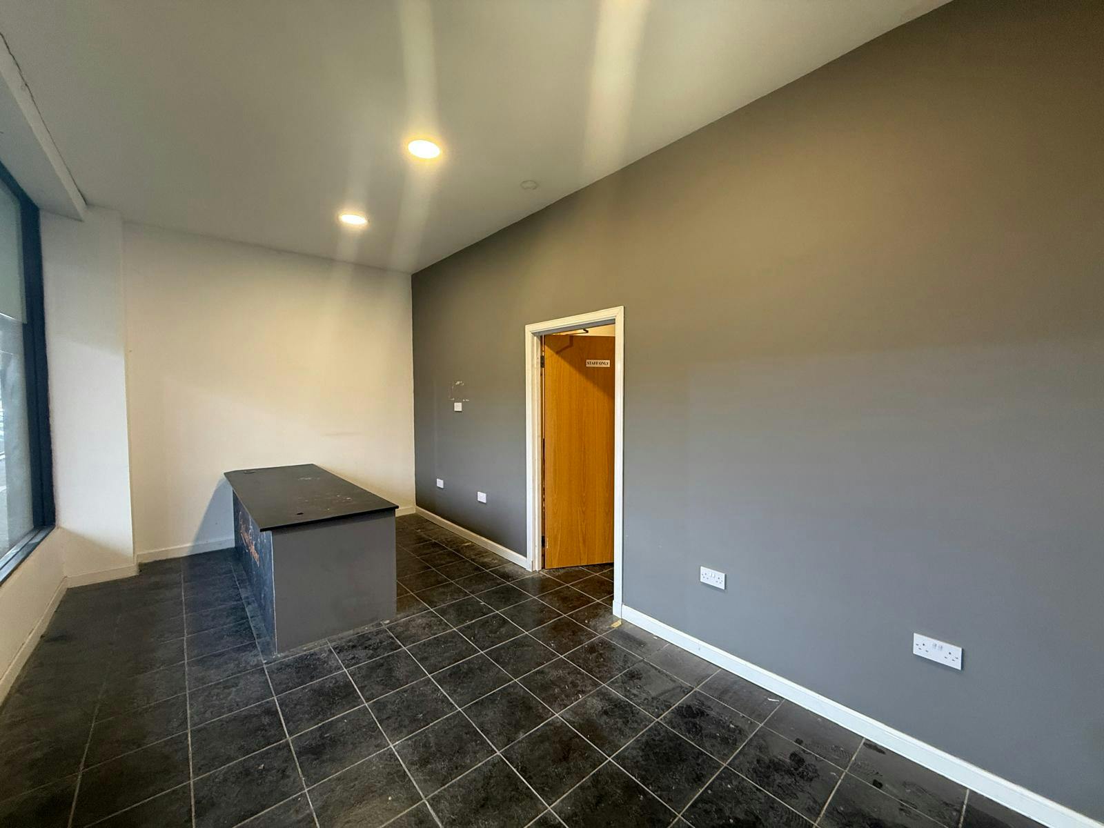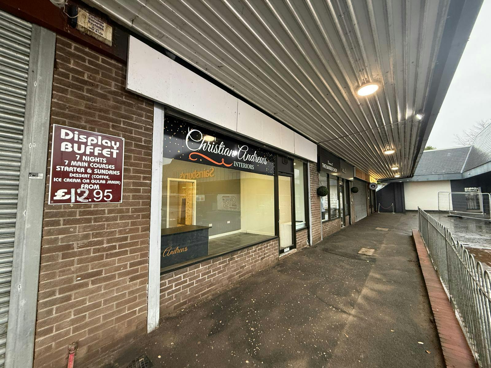 new Sainsbury’s supermarket. The available unit is located at the eastern end of the terrace, adjacent to Sainsbury’s. It has aluminium framed display windows and entrance door, protected by an electric roller shutter. Internally, the unit has a front customer area with storage and staff kitchen/toilet facilities located to the rear. The current partitions within the property can be removed, subject to discussion. There is a door located to the rear, protected by a security roller shutter.