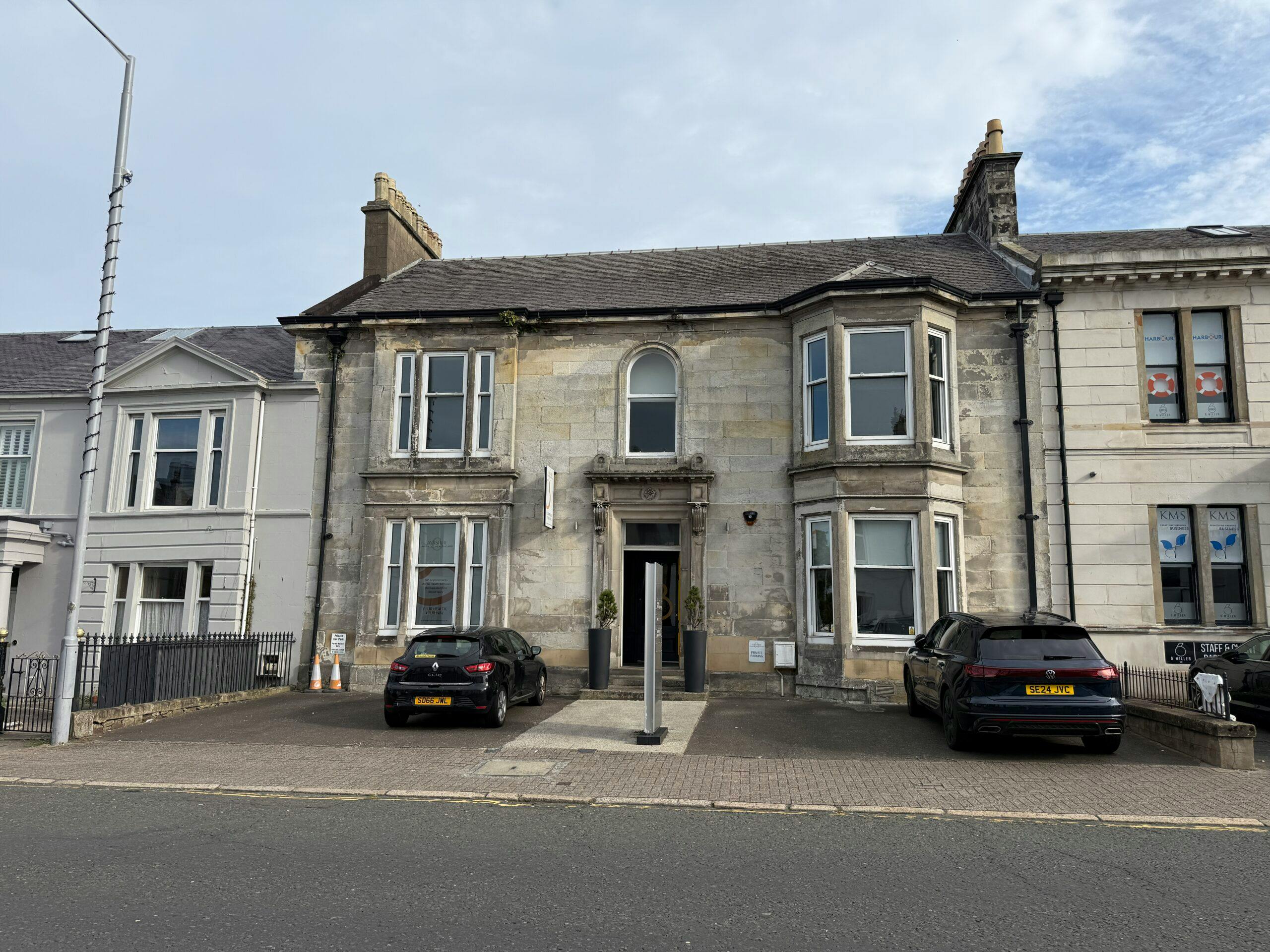 Miller Road is one of the most desirable office districts in Ayr town centre, located a short distance from Ayr railway station with its regular and fast services to Glasgow and the main bus terminal, serving all of Ayrshire and beyond. There is on-street and ‚òlow cost‚ public car parking in the immediate vicinity. The building occupies a prominent position on the street with a short walk to an array of amenities including shops, eateries, licensed venues and Ayr beachfront. Occupiers nearby include a mix of wellbeing and professional service providers including surveyors, accountants and solicitors.